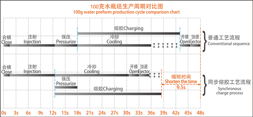 開合模同步熔膠功能,縮短生產(chǎn)周期,提高產(chǎn)量。